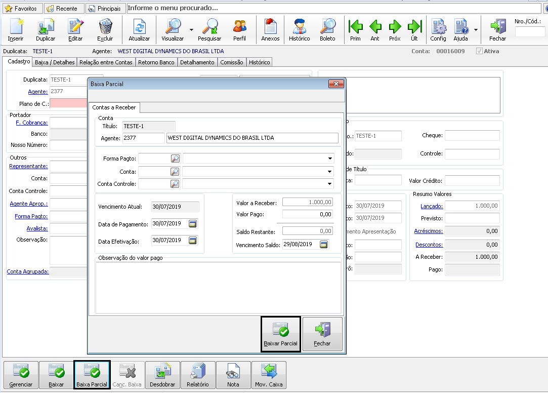 Após confirmar a baixa, o sistema irá criar uma nova conta com o valor do saldo em aberto.