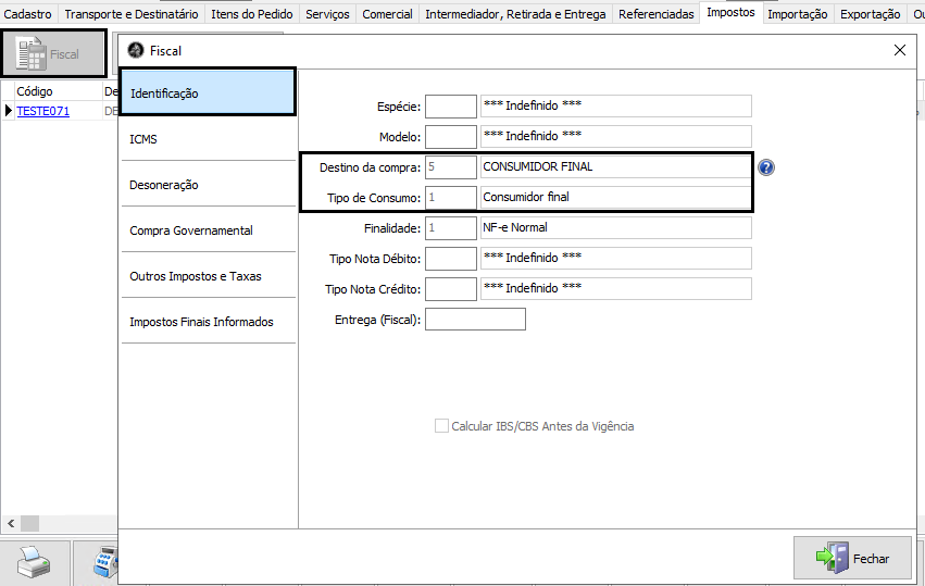Para atualizar os dados do pedido, o mesmo deverá ser editado e salvo. No caso de ajustes diretamente no Pedido, acesse o menu Comercial / Pedido, aba "Impostos", botão "fiscal" e nos campos de "identificação" informe o "Destino da Compra" e "Tipo de Consumo" como "Consumidor Final".
