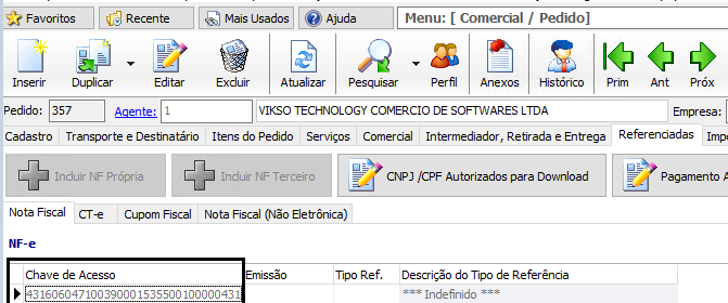No Pedido, através do menu Comercial / Pedido, aba "Referenciadas", grid "NF-e", informe a Chave de Acesso correta.