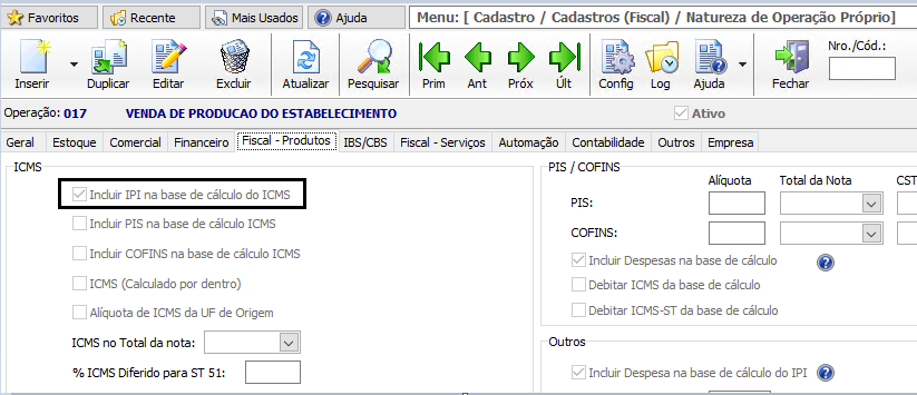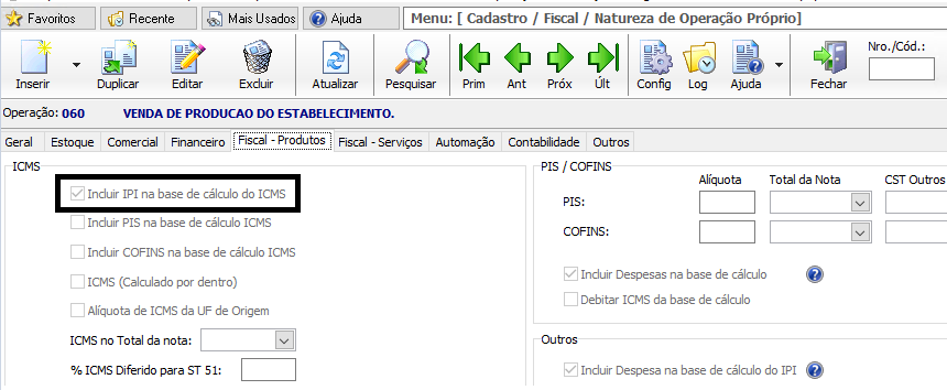 Para incluir o IPI na Base de Calculo do ICMS nas notas fiscais próprias, acesse o menu: Cadastro / Fiscal / Natureza de Operação Próprio, aba "Fiscal - Produtos", no grupo de "CMS", marque a opção "Incluir IPI na base de cálculo do ICMS".