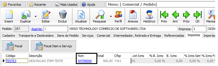 1ª) Após excluir a NF-e, acesse o menu Comercial/Pedido e identifique na aba "Impostos" o NCM.