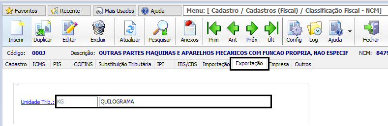 No Cadastro de Classificação Fiscal - NCM, acesse a aba Exportação e informe no campo Unidade Trib. conforme consta na "Tabela de NCM e respectiva uTrib (Comércio Exterior)".