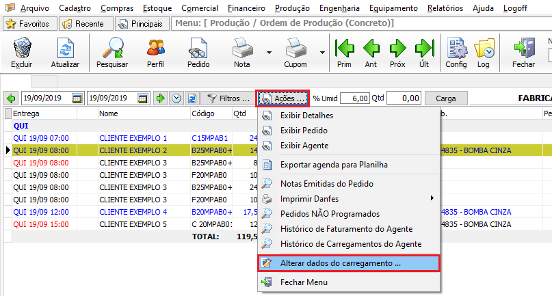 - Localize o cliente (pedido) no menu Produção / Ordem de Produção (Concreto).