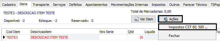 Na Ordem de Serviço, para identificar os valores de ICMS Efetivo para Consumidor Final, acesse o Menu: Assistência / Ordem de Serviço – OS, aba dos Itens, no botão “Ações” opção “Impostos CST 60, 500...".