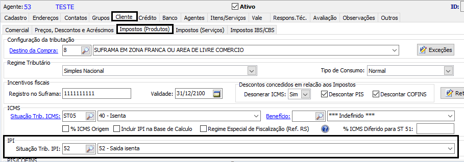 No Sistema Odin acesse o menu Cadastro/Agente, e na aba Cliente/Impostos (Produto) informe a “Situação Trib. IPI” no campo referente ao IPI.