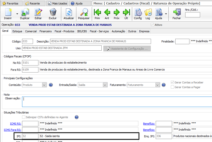 - Cadastro Natureza de Operação Próprio