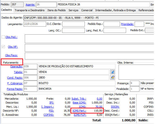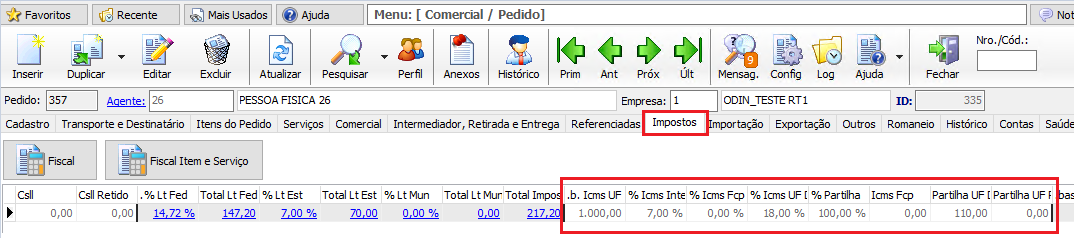 4.2 Localização do campos preenchidos no Sistema Odin no Menu Comercial/ Pedido nas abas Cadastro e "Impostos com valores do Diferencial de Alíquota Não Contribuinte: