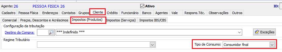- Acesse o Menu: Cadastro / Agente, na aba Cliente/Impostos (Produtos) selecione no "Tipo de Consumo" "Consumidor Final".
