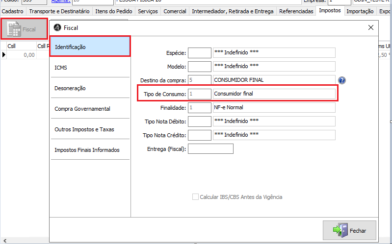 - Acesse o Menu: Comercial/ Pedido, na aba Impostos, acesse o botão Fiscal, grupo Identificação e selecione no "Tipo de Consumo" "1 - Consumidor Final".