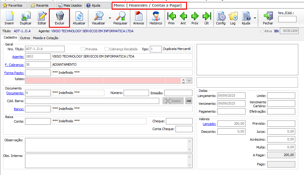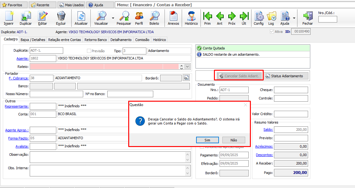 Exemplo: O adiantamento abaixo tem R$ 200,00 de saldo. Ao clicar no botão “Cancelar Saldo Adiant.” o sistema irá gerar um Contas a Pagar para o agente 1802 neste valor.