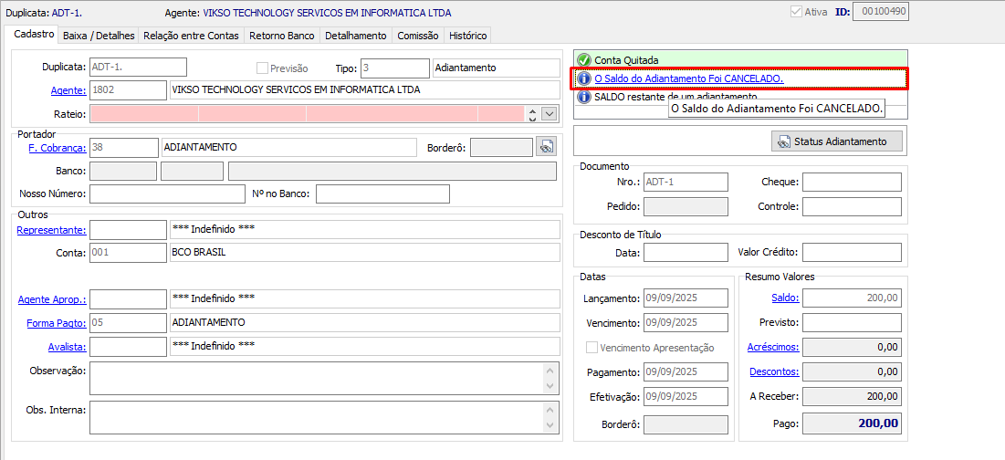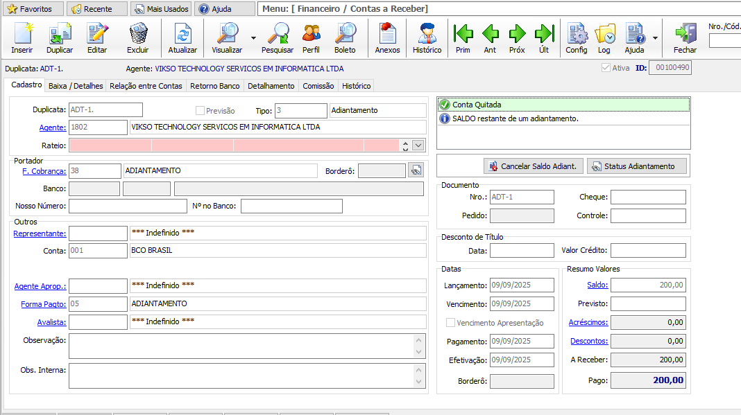 Após realizar a baixa de uma duplicata contra o adiantamento, é possível consultar o saldo em aberto do agente.