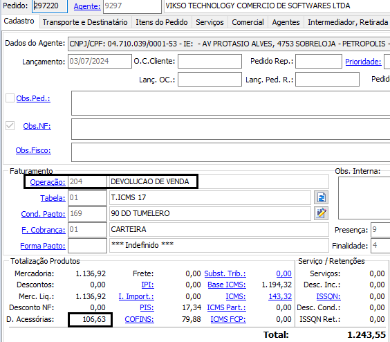 Após salvar o registro o total da Substituição Tributária será exibido no campo D. Acessórias da aba Cadastro do Pedido.