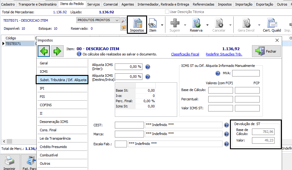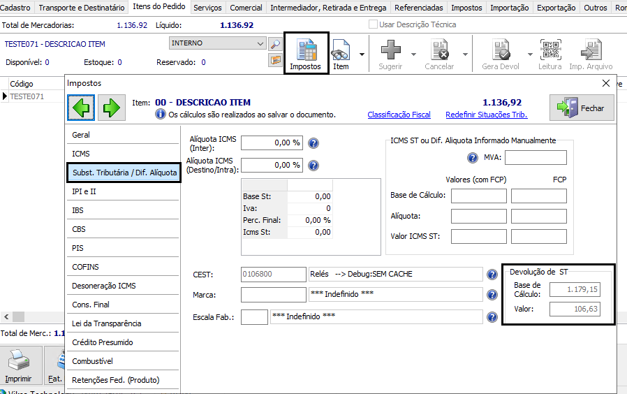 Acesse Comercial / Pedido, aba Itens do Pedido, botão Impostos/Subst. Tributária/Dif. e informe no grupo Devolução de ST os valores de Base de Cálculo e Valor de acordo com o documento a ser devolvido para cada Item.