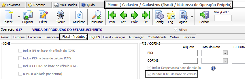 Para que o ICMS debite da Base de Cálculo do PIS e da COFINS, será necessário acessar o Menu: Cadastro / Fiscal / Natureza de Operação de Próprio, aba Fiscal – Produtos grupo PIS/COFINS, marcar o checkbox “Debitar ICMS da base de cálculo”.