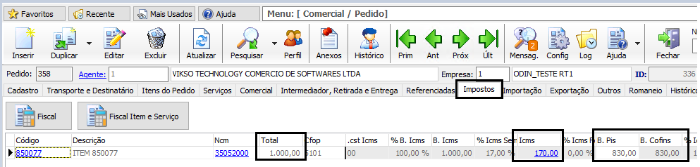 Após a configurar a Natureza de Operação Próprio, ao informar o código no pedido, o valor calculado ou informado do ICMS será debitado da Base de Cálculo do PIS e da COFINS.