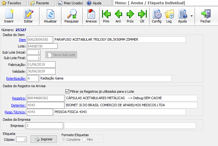 - Dados do Item: para fazer a impressão individual, basta inserir um novo registro e informar o Item em que deseja fazer a etiqueta, a informação do lote, assim como o Sub Lote (número de série) Inicial e Final. Caso o item tenha um Sub Lote de 1 até 10, basta informar estes Sub Lote de Inicial (1) e Final (10), desta forma, gerando os números de série deste item para a etiqueta. Nesta parte do registro também deverá ser inserido a data de fabricação e validade deste item, para esta etiqueta, assim como informar o processo de esterilização.