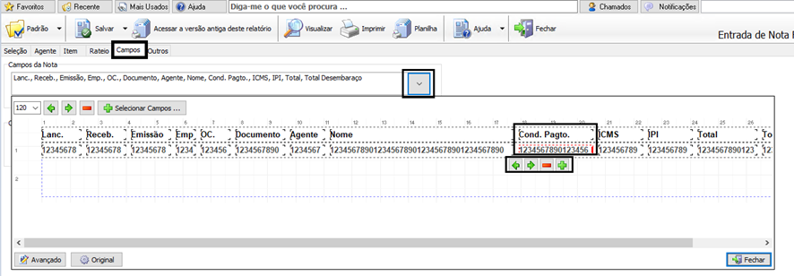 O Relatório de Entrada de Nota Fiscal que fica no Menu: Relatórios / Compras / Entrada de Nota Fiscal possuí o recurso de Campos da qual o usuário pode selecionar, dimensionar e ordenar conforme a sua necessidade.
