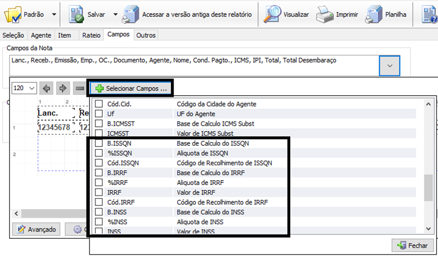 Na imagem abaixo consta algumas opções de seleção de campos para nota de serviço.