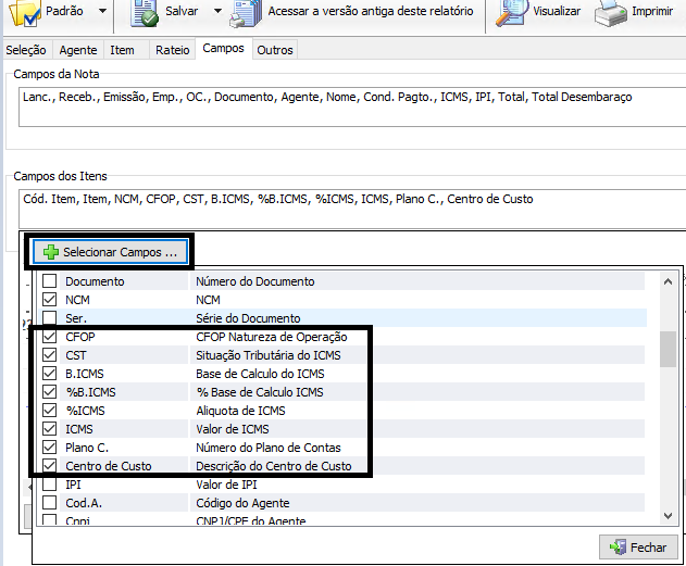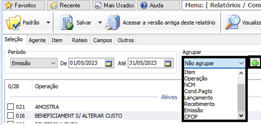 O grupo de Seleção “Outras Opções” do Layout antigo foram distribuídos entre os Agrupar, Formato e aba Outros, bem como definidos nos Campos.