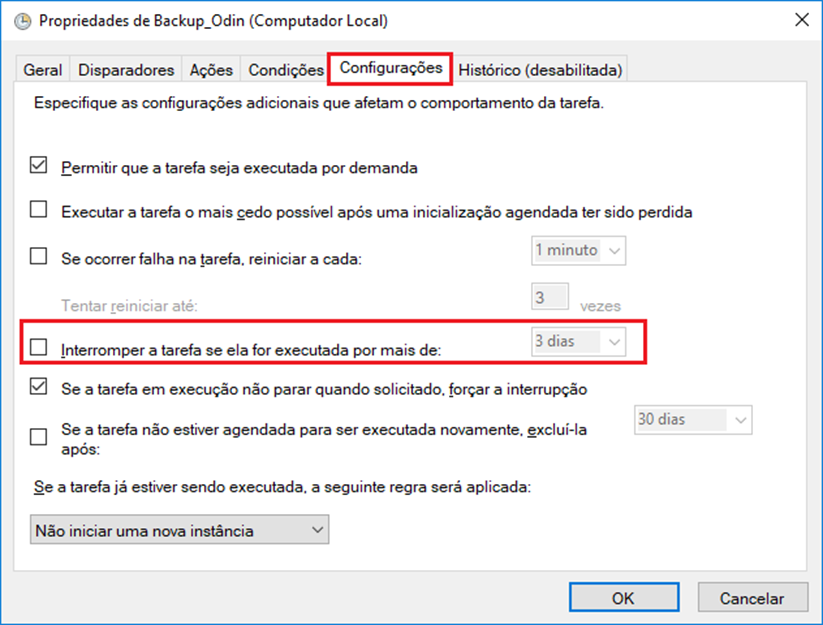 Na guia “Configurações” deve ser desmarcada a opção “Interromper a tarefa se ela for executada por mais de:” e clicar no botão “OK”.