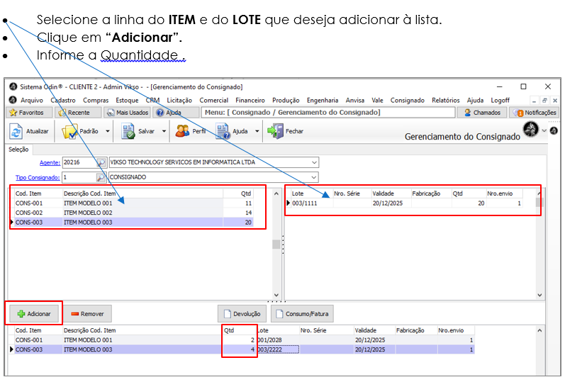 No grid superior será apresentado os registros filtrados, mais abaixo a relação dos itens e os respectivos lotes.