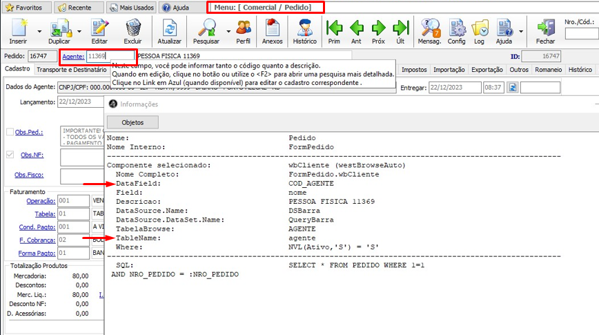 Para localizar o nome da tabela associada a um componente específico, siga os passos abaixo. Neste exemplo, demonstraremos como identificar o campo "Agente" utilizado no lançamento de um Pedido.