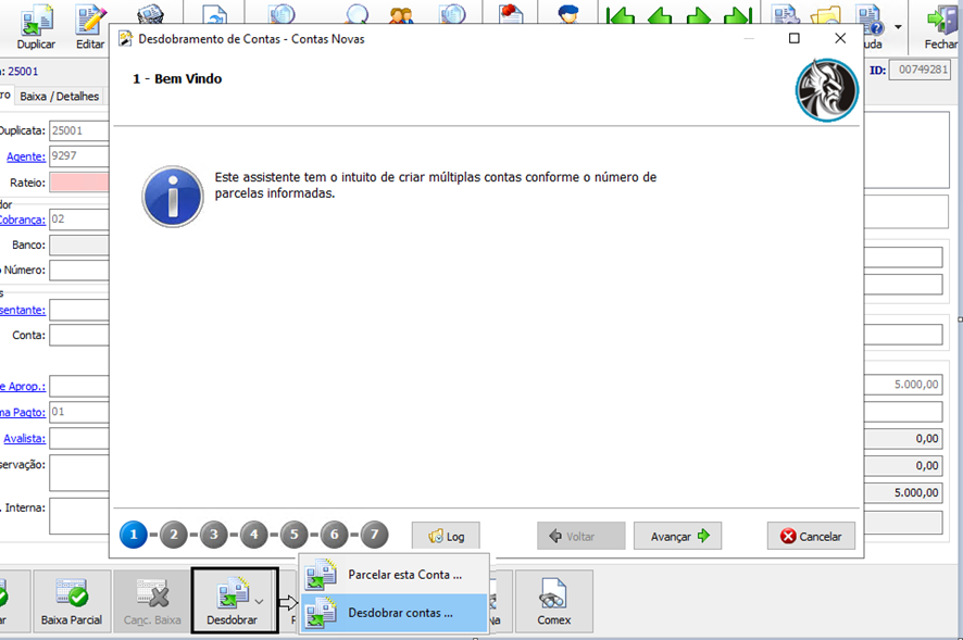 Ao usar o botão Desdobrar a partir de uma duplicata ou título, o Assistente iniciará o processo de Parcelar esta conta ou Desdobrar contas, preenchendo a maior parte das informações automaticamente, conforme os passos abaixo: