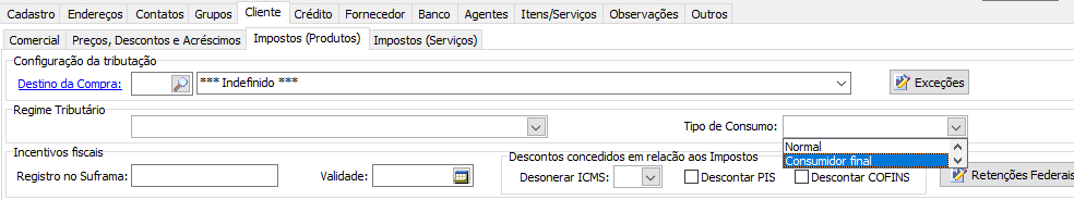 - Para evitar a rejeição “Operação com não contribuinte deve-se indicar operação com consumidor final”, navegar até a aba “Cliente”, sub-aba “Impostos (Produtos)” e marcar “Consumidor Final”;