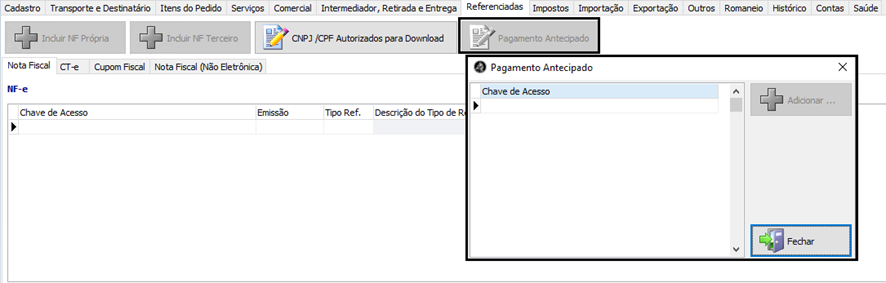 Para o preenchimento do grupo de notas de antecipação de pagamento, acesse a aba Referenciadas do Pedido e clique no botão Pagamento Antecipado.