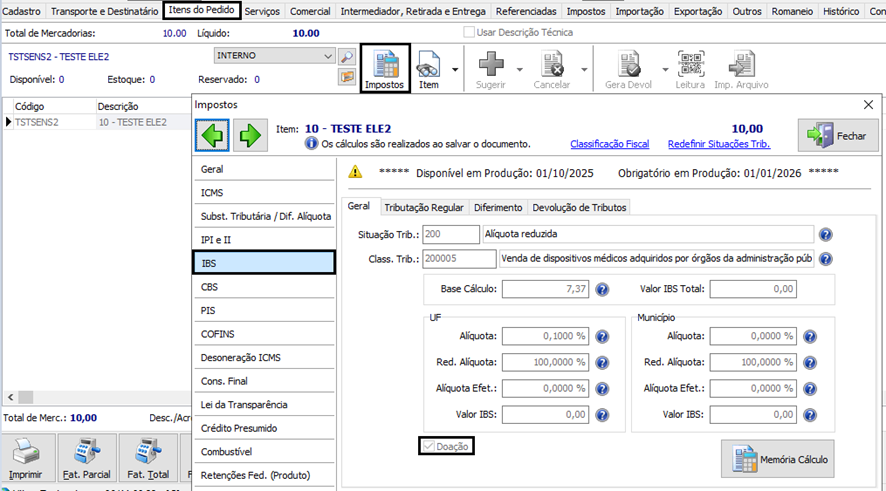 No Sistema Odin, foi criado, no grupo IBS, um novo campo (checkbox) para marcar "Doação" no botão Impostos, localizado na aba Itens do Pedido.