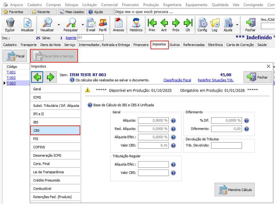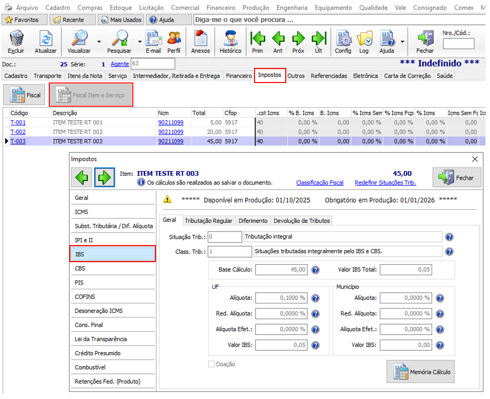 A partir da versão com vigência em 01/10/2025, o sistema passa a permitir a visualização dos novos impostos IBS e CBS diretamente na tela da Nota Fiscal, conforme estabelecido pela Reforma Tributária.